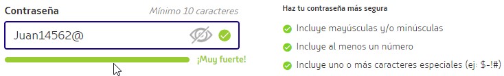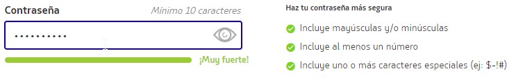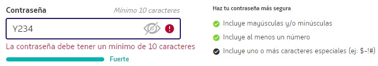 Se debe comprobar que la contraseña cuenta con los parámetros de seguridad establecidos (letras mayúsculas, letras minúsculas, caracteres especiales o números), además de ocultar el valor que se introduce en el campo (por ejemplo, con puntos o asteriscos) para impedir que otros puedan leerlo.
