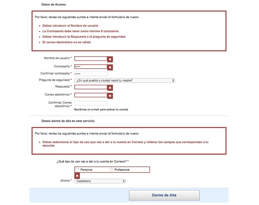 Mala práctica: Sin embargo, en el formulario de alta de la web de Correos no se informa de las características que debe tener cada campo. Cosa que hace que hasta que el usuario no valida el formulario, éste no sabe que por ejemplo el campo ‘Contraseña’ debe