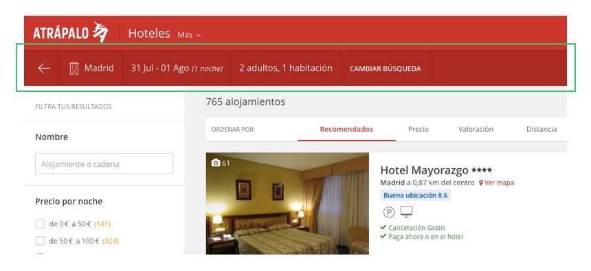 Buena práctica: Siempre se deben indicar los campos por los cuales se ha realizado una búsqueda. Por ejemplo, en la imagen se muestra una leyenda en la parte superior con los parámetros por los cuales se ha buscado un hotel.