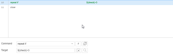Este bloque condicional permite evaluar una expresión JavaScript, la condición se coloca en el campo del Target y en Command se coloca if, si la expresión a evaluar es verdadera, continua con la siguiente instrucción, si, por el contrario, es falsa, salta a la instrucción end (comando de cierre) terminando el bloque condicional.