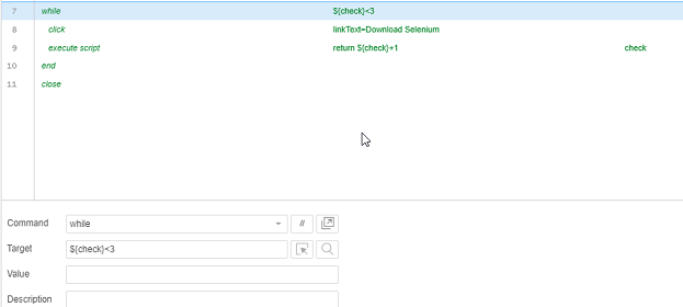 En las versiones recientes de Selenium IDE se permite implementar condiciones y bucles a las pruebas que se crean, haciendo que se puedan ejecutar los comandos a partir de ciertas condiciones o ejecutarlas repetidas veces los comandos que funcionan para esto son: