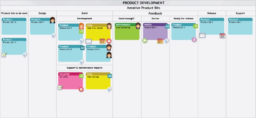 Por ejemplo, un equipo puede dividir las tareas que deben realizarse para una característica en el diseño, código, prueba y despliegue. Cuando se alcanza un límite WIP para una determinada tarea, el equipo se detiene y trabaja en conjunto para eliminar el cuello de botella. El objetivo de trabajar de esta manera es asegurar que todo el equipo se apropie del proyecto y produzca códigos de alta calidad.