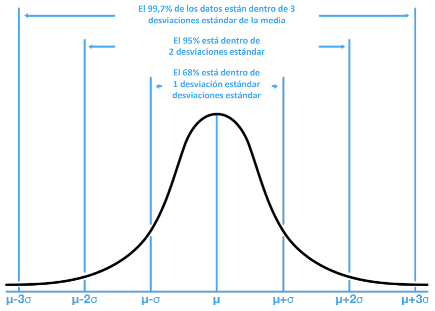 ● Recordemos que, dentro de la distribución normal, el 99% de los puntos de datos se sitúan dentro de las tres desviaciones estándar de la media
