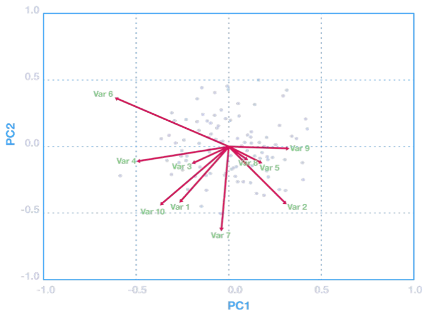 ● Un biplot utiliza puntos para representar las puntuaciones de las observaciones en los componentes principales, y utiliza vectores para representar los coeficientes de las variables en los componentes principales (Figura: Ejemplo de un biplot)