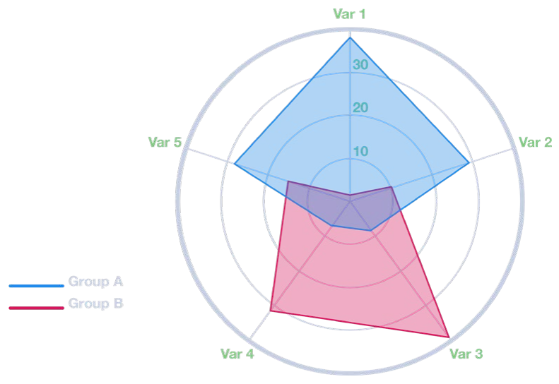 ● La posición y el ángulo relativos de los ejes no suelen ser informativos. El gráfico de radar también se conoce como gráfico de araña debido a la naturaleza de su diseño (Figura: Ejemplo de gráfico de radar)