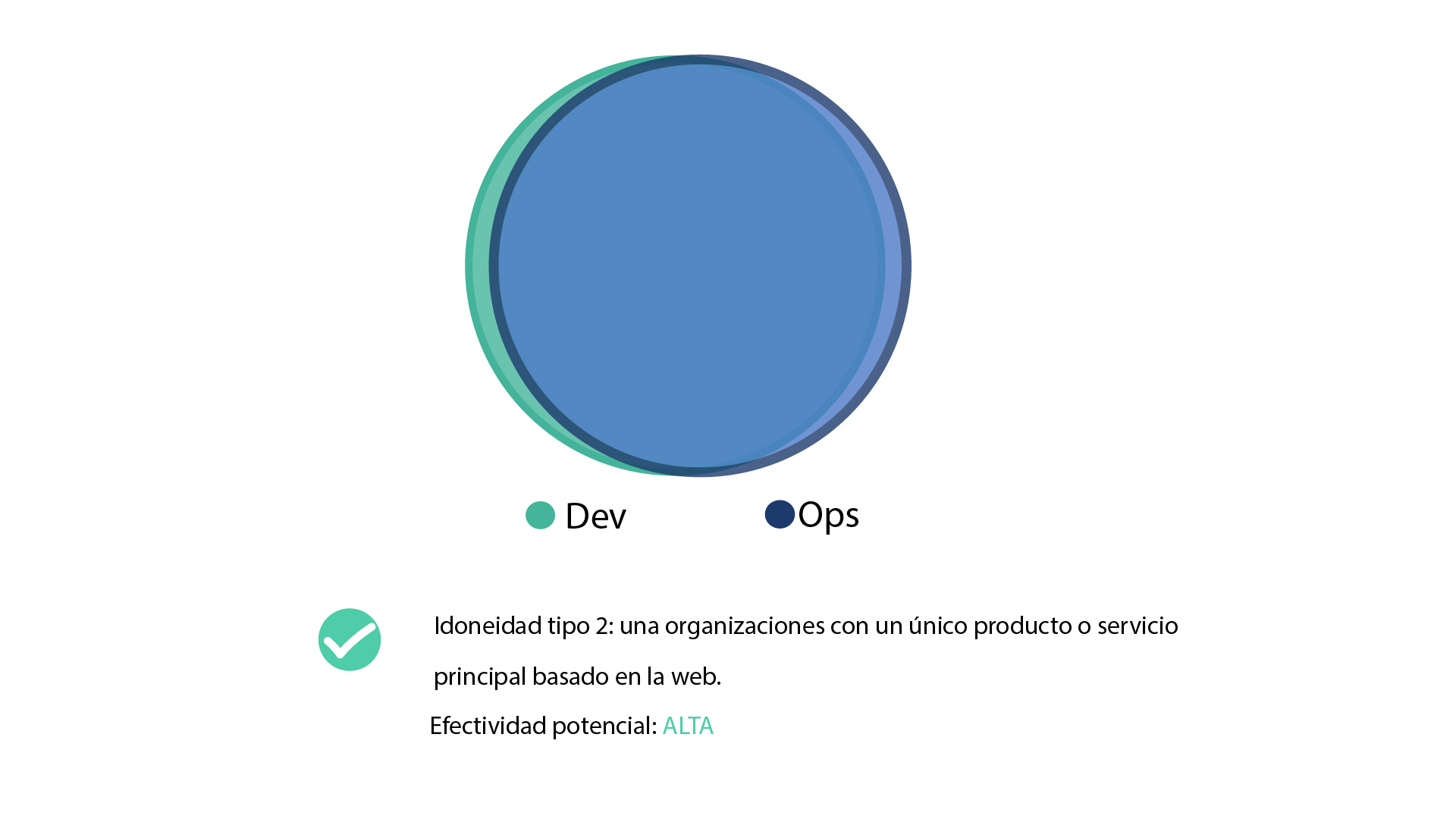 Donde la gente de operaciones se ha integrado en los equipos de desarrollo de productos, vemos una topología de Tipo 2. Hay tan poca separación entre Dev y Ops que todas las personas están muy enfocadas en un propósito compartido; esta es discutible una forma de Tipo 1 (Colaboración de desarrollo y operaciones) , pero tiene algunas características especiales.