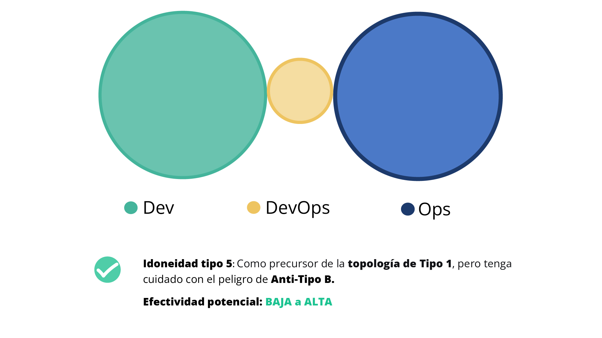 El equipo de DevOps con una fecha de caducidad (tipo 5) se parece sustancialmente al antitipo B (silo del equipo de DevOps), pero su intención y longevidad son bastante diferentes. Este equipo temporal tiene la misión de acercar Dev y Ops, idealmente hacia un modelo Tipo 1 (Colaboración de desarrollo y operaciones) o Tipo 2 (Responsabilidades de operaciones totalmente compartidas), y eventualmente volverse obsoleto.