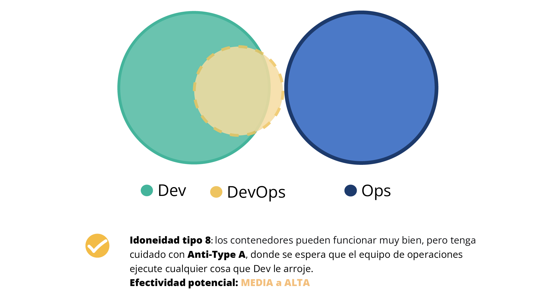 Los contenedores eliminan la necesidad de algunos tipos de colaboración entre Dev y Ops al encapsular los requisitos de implementación y tiempo de ejecución de una aplicación en un contenedor. De esta forma, el contenedor actúa como un límite entre las responsabilidades de Dev y Ops. Con una cultura de ingeniería sólida, el modelo de colaboración impulsada por contenedores funciona bien, pero si Dev comienza a ignorar las consideraciones operativas, este modelo puede convertirse en un 'nosotros y ellos' contradictorio.