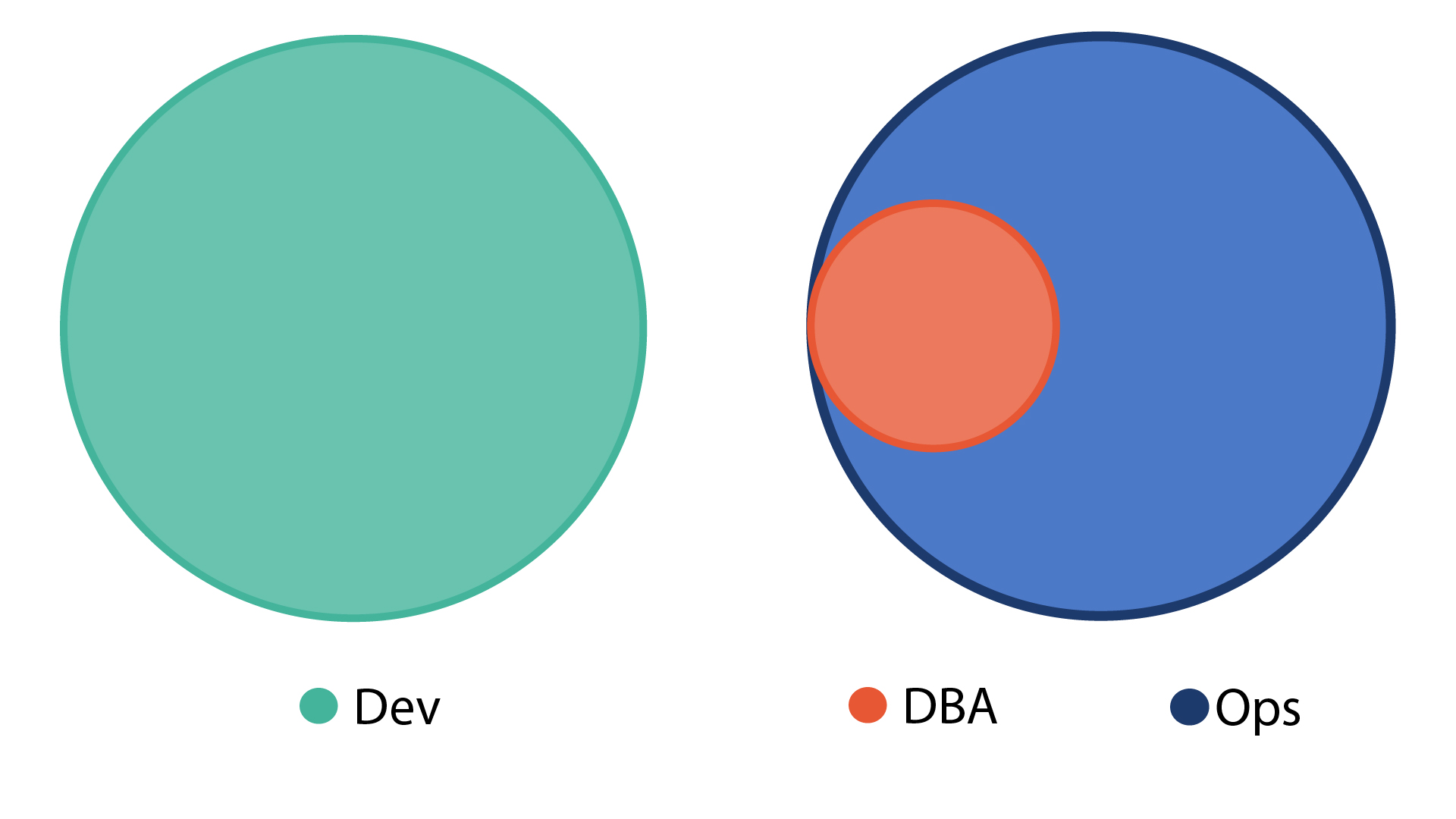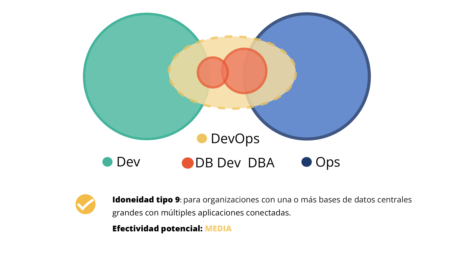 Para cerrar el abismo Dev-DBA, algunas organizaciones han experimentado con algo como el Tipo 9, donde una capacidad de base de datos del equipo DBA se complementa con una capacidad de base de datos (o especialidad) del equipo Dev. Esto parece ayudar a traducir entre la vista centrada en Dev de las bases de datos (como tiendas de persistencia esencialmente tontas para aplicaciones) y la vista centrada en DBA de las bases de datos (fuentes inteligentes y ricas de valor comercial).