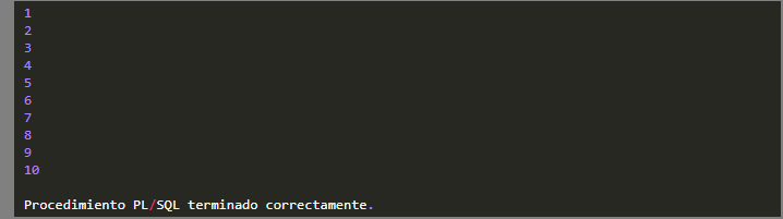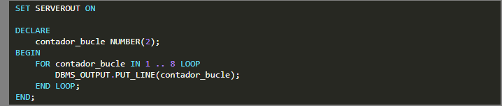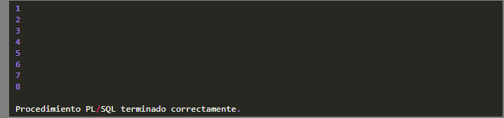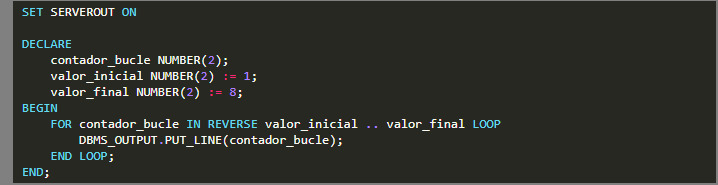 Usaremos la palabra reservada REVERSE para imprimir los números del 1 al 8 de manera descendente.
