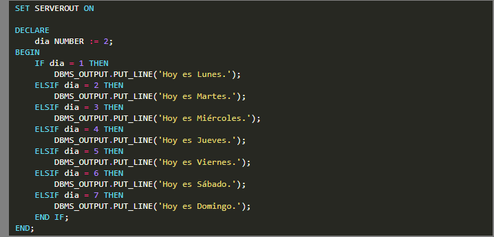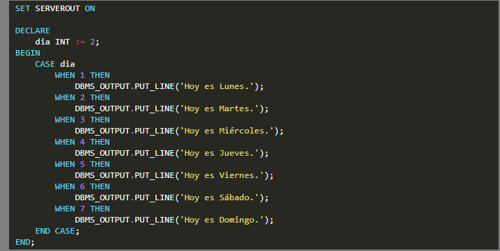 Se hará el mismo ejemplo de los días de la semana usado en la explicación de la sentencia IF, pero ahora utilizando CASE.