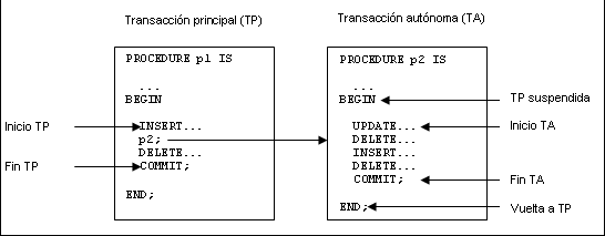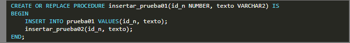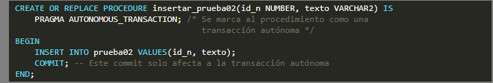 Luego implementamos dos procedimientos almacenados insertar_prueba01 e insertar_prueba02 que su función será ingresar filas a cada una de estas tablas (PRUEBA01 y PRUEBA02), con la particularidad que además de que insertar_prueba01 llamará al procedimiento insertar_prueba02, este último procedimiento será marcado como una transacción autónoma, es decir, una transacción totalmente independiente a la principal.