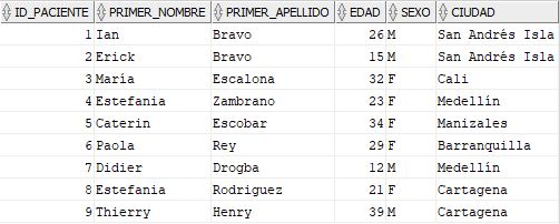 La tabla PACIENTE será utilizada para este ejemplo.