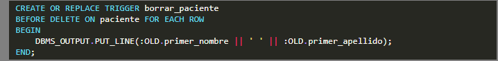 Para esto creamos un trigger llamado borrar_paciente la cual se muestra a continuación.