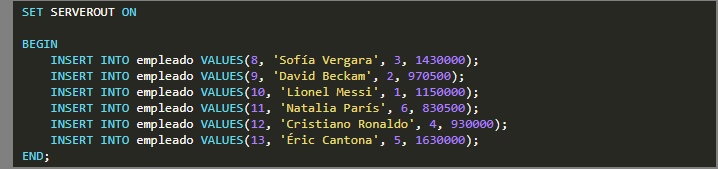 Luego en otro script insertemos nuevos empleados a la base de datos usando el bloque PL/SQL.