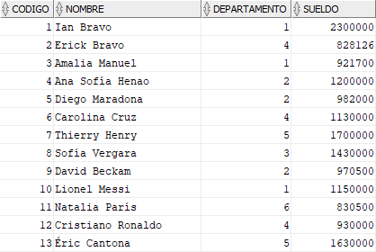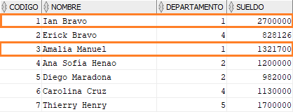 Y para estar más seguros miramos nuestra tabla EMPLEADO para verificar si se actualizaron o no los salarios de los empleados que pertenecen al departamento 1.