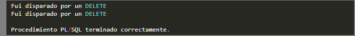 Nos imprime el mensaje dos veces debido a que el trigger utiliza la cláusula FOR EACH ROW y recordemos que esta cláusula activa el disparador una vez por cada registro que se ve afectado por la operación, que en nuestro caso es DELETE y como los empleados que estaban en el departamento 1 eran 2, se activa dos veces el trigger.