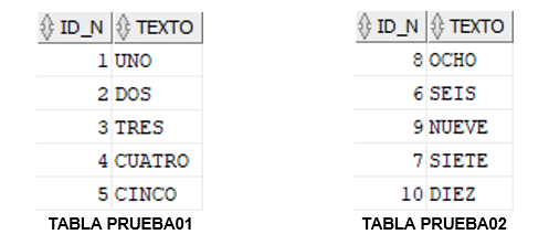 Para esto crearemos dos tablas nuevas que se llamarán PRUEBA01 y PRUEBA02. La PRUEBA01 tendrá la siguiente estructura y datos.