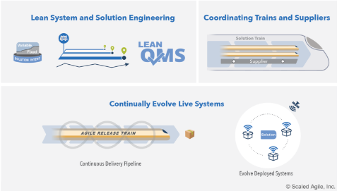 Equipos de equipos ágiles (Teams of Agile Teams): A nivel empresarial, la construcción de soluciones por lo general requiere que los recursos invertidos bien sean materiales como intelectuales que proporcionan los equipos ágiles, deben de cubrir un terreno mucho más amplio, es claro, que ningún equipo desde el punto de vista particular o “individual” tiene la capacidad de construir y entregar grandes soluciones dentro de un tiempo razonable, por lo tanto, se tiene la necesidad de que múltiples equipos participen, el Tren de lanzamiento ágil (ART) de SAFe es un equipo de equipos ágiles de larga vida que, junto con otras partes interesadas, desarrolla, entrega y, cuando corresponde, opera una o más soluciones.