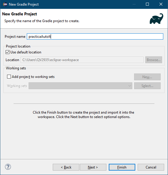 En la ventana New Gradle Project, colocamos como nombre del proyecto “practicaAutoIt”, dejamos la ruta por defecto donde se estará ubicada nuestro proyecto y le damos clic en el botón “Finish”.