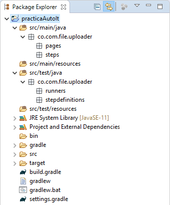 Eliminamos la clase Library.java que se encuentra en el paquete practicaAutoIt de los directorios src/main/java y src/test/java. Después cambiamos el nombre del paquete practicaAutoIt de ambos directorios por co.com.fileuploader.