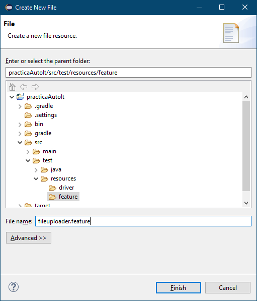 Ahora creamos nuestra historia de usuario que vamos a probar, entonces le damos clic derecho en el proyecto y seleccionamos New -> File. En la ventana Create New File buscamos la ruta hacia nuestro paquete feature que es src/test/resources/feature, luego en el nombre del archivo colocamos fileuploader.feature y para finalizar le damos clic en el botón Finish.
