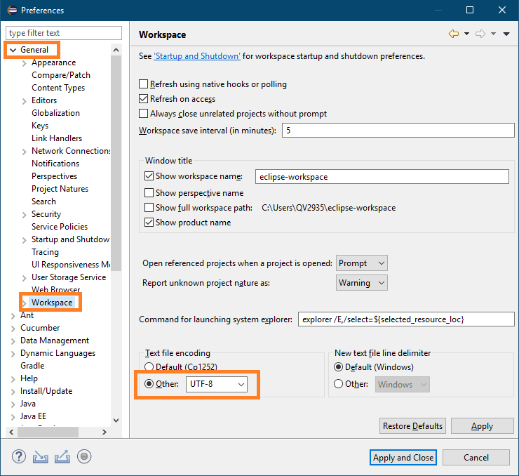 Vemos que como utilizamos Gherkin en español, hay ciertos caracteres como las tildes que cuando Cucumber haga la traducción del lenguaje Gherkin al de programación arrojará un error ya que nuestro IDE Eclipse no está configurado para entender estos caracteres, para solucionar esto nos dirigimos a la barra de menú de Eclipse y seleccionamos Window -> Preferences. En la nueva ventana que nos aparece (Preferences) le damos clic en el signo “mayor que” que trae General para que se nos desgloce todas las opciones de éste, luego damos clic en la opción Workspace y en esta sección buscamos el apartado Text file encoding, seleccionamos la opción Other y por último en la lista desplegable escogemos la que dice UTF-8. Una vez hecho esta configuración le damos en el botón Apply y después en Apply and Close para guardar los cambios efectuados.