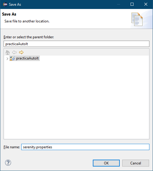 Cuando queramos guardar el archivo nos saldrá una ventana en donde elegimos la carpeta padre donde se alojará este archivo que será practicaAutoIt y el nombre que le vamos a poner al archivo que es serenity.properties.