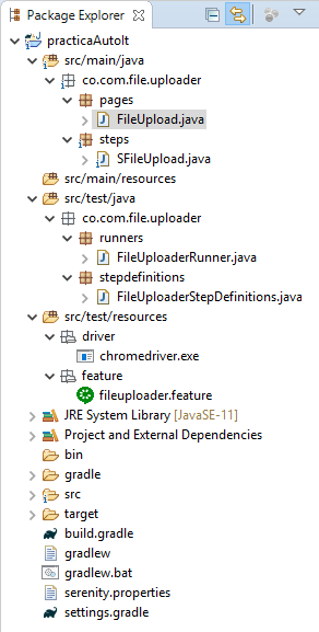 Luego en el paquete stepdefinitions creamos la clase FileUploaderStepDefinitions que describirá el “qué” está haciendo nuestra prueba. Cuando tengamos la clase copiamos las siguientes líneas de código: