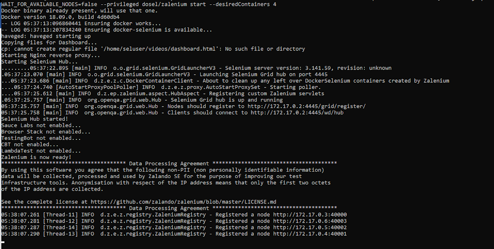 docker run --rm -ti --name zalenium -p 4444:4444 -v /var/run/docker.sock:/var/run/docker.sock -v /tmp/videos:/home/seluser/videos -e WAIT_FOR_AVAILABLE_NODES=false --privileged dosel/zalenium start --desiredContainers 4