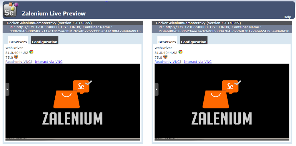 Zalenium Live Preview: Por medio de este panel se puede visualizar la ejecución de la prueba, acceder directamente al nodo de selenium grid permitiendo interactuar con él. Tiene una serie de configuraciones donde encontramos la dirección de red dirigiéndose al proxy creada por selenium grid , cambar colores del menú entre otras funciones.