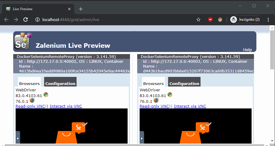 Una vez descargadas las dependencias necesarias para poder ejecutar el proyecto, y el contenedor de Zalenium, se debe abrir el siguiente panel: http://localhost:4444/grid/admin/live, donde se podrá observar en vivo la ejecución del proyecto.