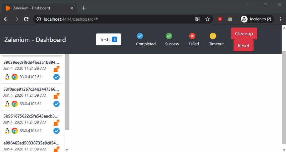 En el panel de Dashboard que está en el link http://localhost:4444/dashboard/ podremos observar cada una de las grabaciones que hizo Zalenium para las pruebas ejecutadas en cada navegador de Google Chrome.