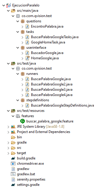 El proyecto que se mostrará para realizar la demostración del funcionamiento de Zalenium, será una automatización hecha con el patron de diseño Screenplay, cuenta con Serenity para la documentación de las pruebas y la estructura del proyecto será la siguiente.