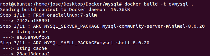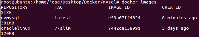 Terminada la ejecución del comando podremos listar las imágenes que tenemos en docker, donde veremos una imagen llamada oraclelinux, esta imagen se descarga del dockerfile para usarla como base para la nueva imagen a crear, la cual veremos aquí como qvmysql.