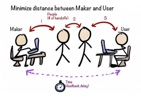 Es vital que una organización visualice la necesidad de minimizar la distancia entre las personas que fabrican el producto (software) y las que lo utilizan (Clientes y/o usuarios finales). Los ciclos breves de retroalimentación son esenciales para construir lo correcto.