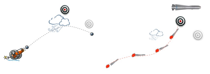 Existen varias formas tradicionales de desarrollo de software, y estas pueden ser como una bala de cañón, mientras que la agilidad se va ajustando gradualmente y se ve como un misil, el cual tiene un objetivo trazado y lo alcanza sin dudarlo.