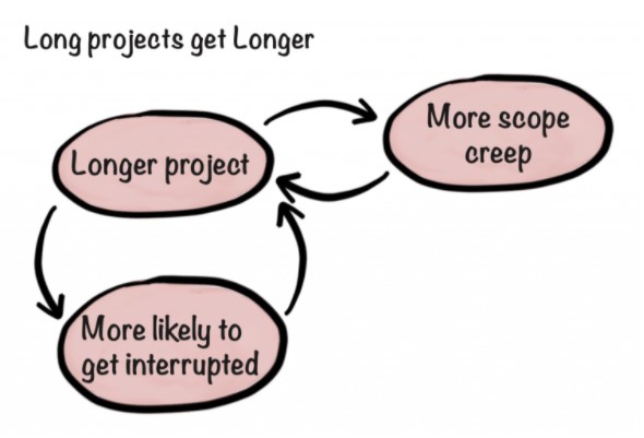 Idea clave: Cuanto más largo sea tu proyecto, más probabilidades tendrás de que el alcance se filtre y te interrumpan, lo que creará un círculo vicioso.