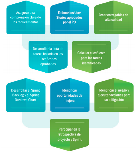 El Development Team consiste en los profesionales que realizan el trabajo de entregar un Incremento de producto “ Done” que potencialmente se pueda poner en producción al final de cada Sprint. Un Incremento “Done” es obligatorio en el Sprint Review, solo