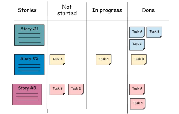 In its most basic form, a task board can be drawn on a whiteboard or even a section of wall. Using electrical tape or a dry erase pen, the board is divided into three columns labeled “To Do”, “In Progress” and “Done”. Sticky notes or index cards, one for each task the team is working on, are placed in the columns reflecting the current status of the tasks.