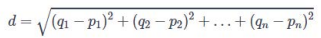 La métrica de similitud funciona comparando un conjunto fijo de características numéricas (otra palabra para atributos) entre dos observaciones, o espacios vitales en nuestro caso, cuando se trata de predecir un valor continuo, como el precio, la principal métrica de similitud es la distancia euclidiana, esta es la fórmula general de la distancia euclidiana: