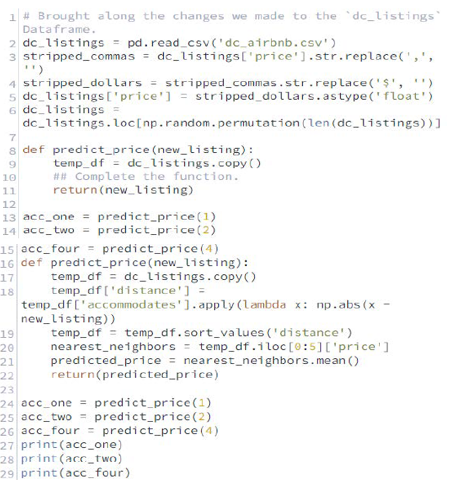 - Escriba una función llamada predict_price que pueda utilizar la técnica de aprendizaje automático k-nearest neighbors para calcular el precio sugerido para cualquier valor de los accommodates, esta función debería hacer lo siguiente: