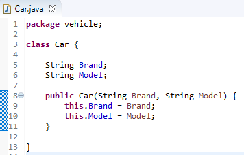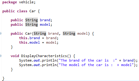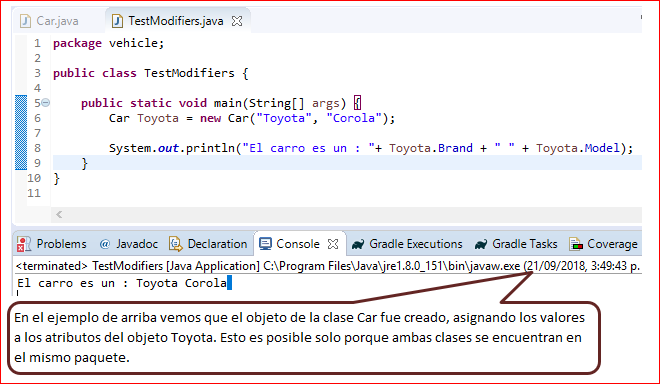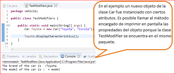 Nótese que los atributos de la clase Car no tienen modificadores de acceso y la clase se encuentra dentro del paquete vehicle.