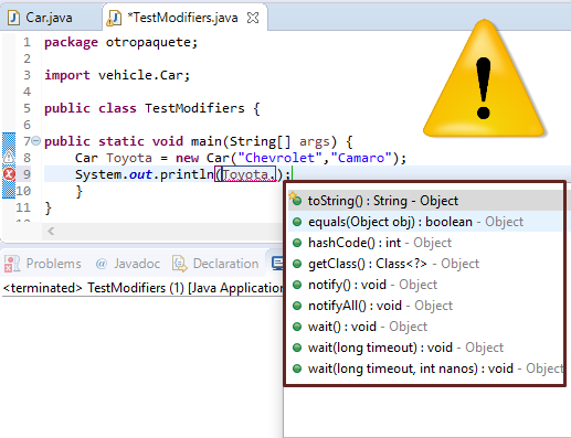 Al tratar de llamar un método de la clase Car desde una clase perteneciente a otro paquete veremos que no es posible acceder a dicho método ya que éste no es accesible desde fuera del paquete Vehicle.