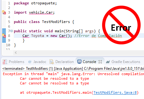 Al tratar de crear un objeto de la clase Car desde una clase perteneciente a otro paquete veremos que al compilar el código un error es lanzado ya que la clase no es accesible desde fuera del paquete Vehicle.