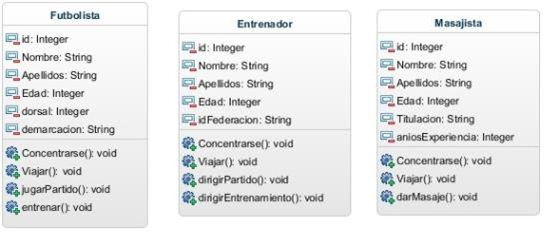 Vamos a simular el comportamiento que tendrían los diferentes integrantes de la selección  de fútbol; tanto los Futbolistas como el cuerpo técnico (Entrenadores, Masajistas, etc…). Para simular este comportamiento vamos a definir tres clases que van a representaran a objetos Futbolista, Entrenador y Masajista. De cada unos de ellos vamos a necesitar algunos datos que reflejaremos en los atributos y una serie de acciones que reflejaremos en sus métodos. Estos atributos y métodos los mostramos en el siguiente diagrama de clases: