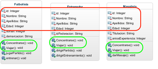 Como se puede observar, vemos que en las tres clases tenemos atributos y métodos que son iguales ya que los tres tienen los atributos id, Nombre, Apellidos y Edad; y los tres tienen los métodos de Viajar y Concentrarse: