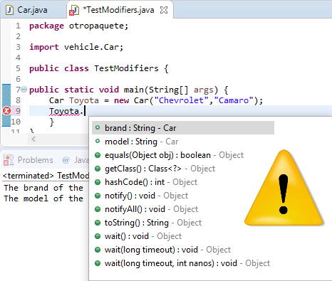 Al tratar de crear un objeto de la clase Car desde una clase perteneciente a otro paquete veremos que al compilar el código un error es lanzado ya que los atributos no son accesibles desde fuera del paquete Vehicle.