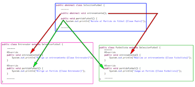 •  Utilizamos la palabra reservada abstract en un método (en el método entrenamiento). Esto quiere decir que todas las clases hijas de la clase "SeleccionFubol" tienen que tener implementado ese método obligatorio. Por tanto con esto se puede afirmar que la clase "SeleccionFutbol" es una clase que puede adoptar diferentes formas y en este ejemplo puede adoptar las formas de "Futbolista", "Entrenador" y "Masajista".