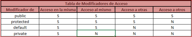 Los modificadores de acceso en java, como su nombre indica, determinan desde qué clases se puede acceder a un determinado elemento.